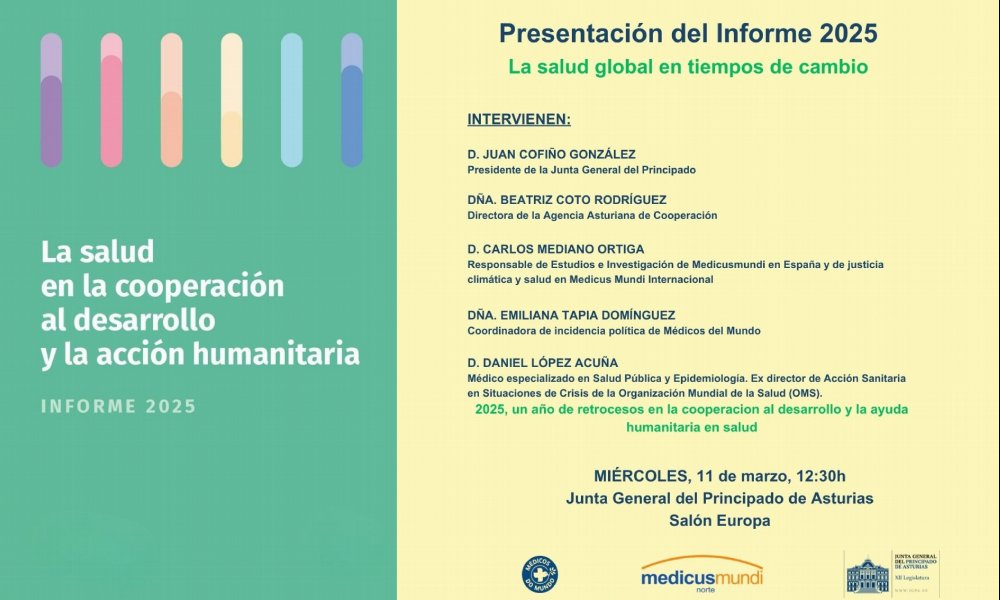 Miércoles, 4 marzo 2026El miércoles 11 de marzo, a las 12.30h, Médicos del Mundo Asturias y medicusmundi norte presentaremos en la Junta General del Principado de Asturias el Informe La salud en la cooperación al desarrollo y la acción humanitaria, que desde hace 24 años editamos conjuntamente con el objetivo de mejorar la calidad de la cooperación en salud.