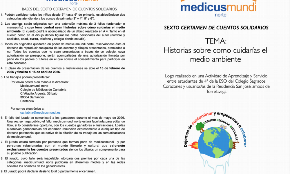 Astelehena,16 otsaila 2026Ya está en marcha el 6º Certamen de Cuentos Solidarios siendo el tema de este año ¿Cómo cuidarías el medio ambiente? para niños y niñas de 3º a 6º de primaria siendo el plazo de presentación desde el 15 de febrero al 15 de abril de 2026.